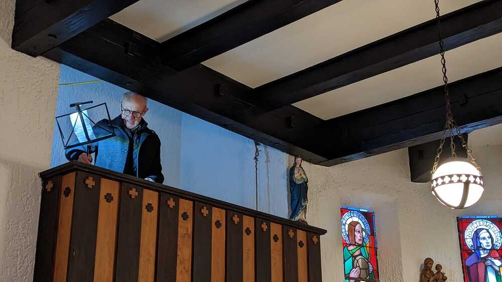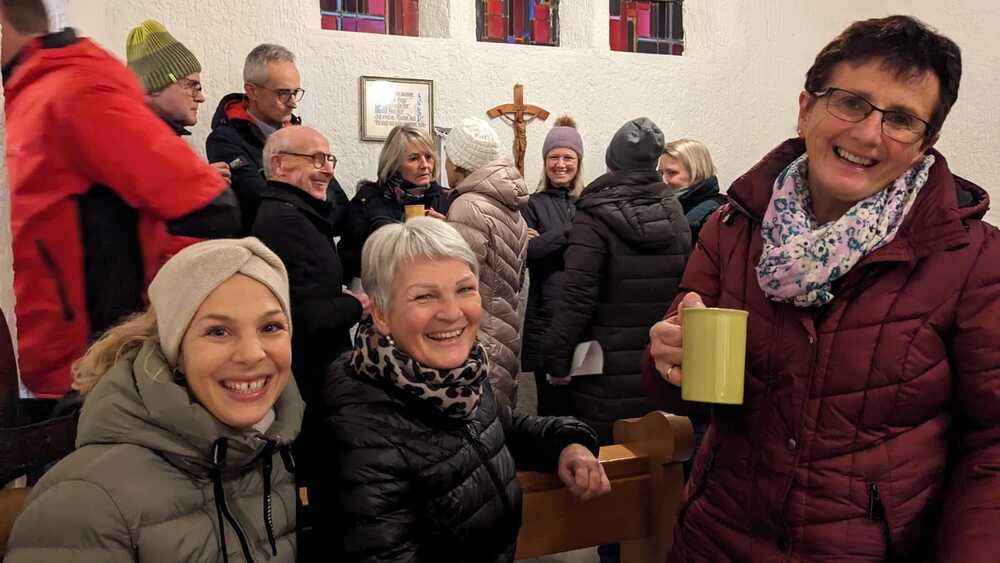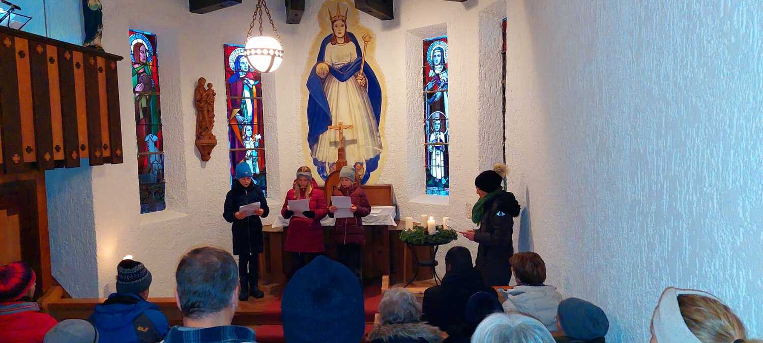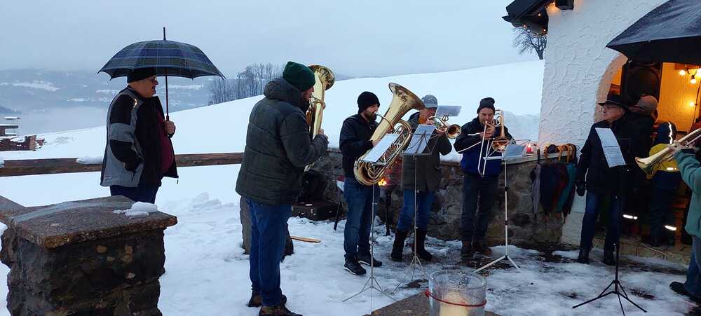 Trotz der nassen Witterung ließen es sich viele Dorener:innen nicht nehmen, zur Kapelle zu kommen. Ein Bläser-Ensemble des MV Doren stimmte auf die besinnliche Andacht in der Kapelle ein, Kinder aus der Nachbarschaft trugen Gedanken zum Licht-sein für Mitmenschen vor. Feine Mundharmonika-Klänge von Johann Giselbrecht umrahmten die STERN.stunden in der Kapelle, der auch Pater Regis beiwohnte.