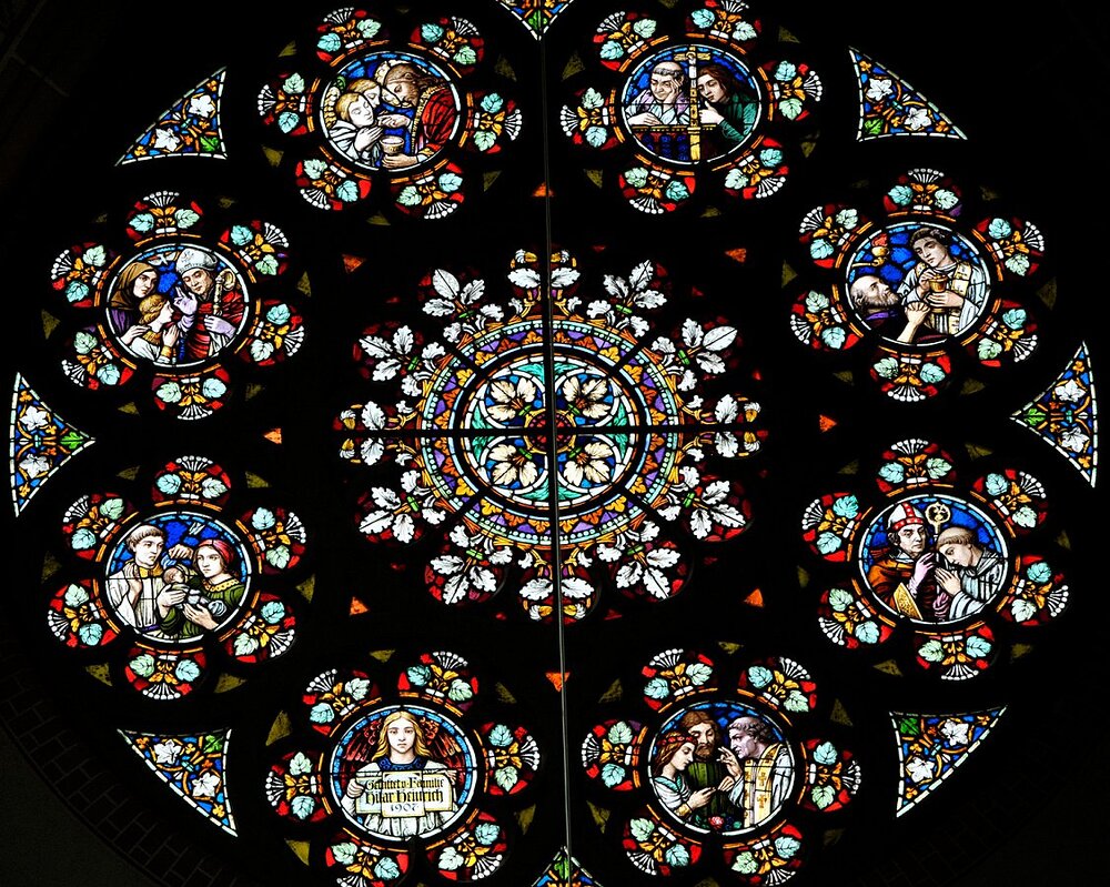 Bregenz, Herz-Jesu-Kirche, Querschiff Rosette: Die Sieben Sakramente, 1907, Tiroler Glasmalerei Anstalt