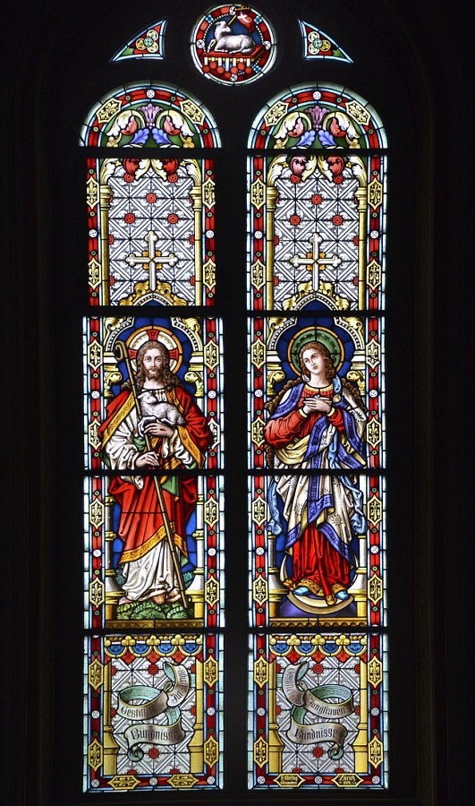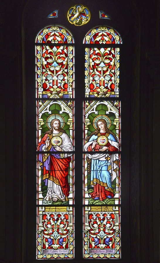 Riezlern, Mariä Opferung, Herz Jesu und Herz Mariens, Entwurf Martin Feuerstein 1891, Ausführung F. Berbig Glasmalerei Zürich