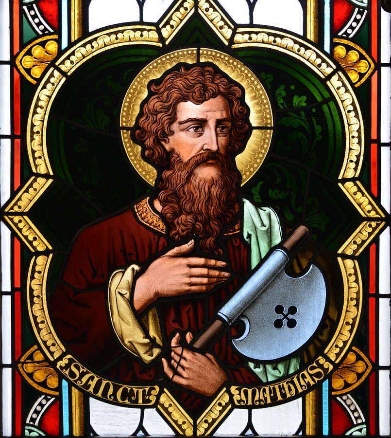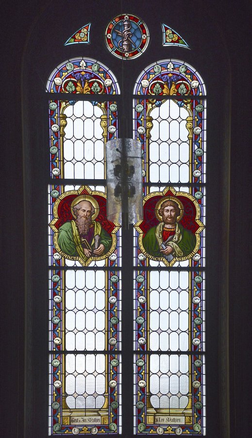 Riezlern, Mariä Opferung, Sankt Mathias mit Beil, Entwurf Martin Feuerstein 1891, Ausführung F. Berbig Glasmalerei Zürich