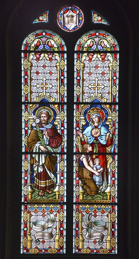 im Chor li. hll. Anna und Joachim, re. Herz Jesu und Herz Mariens, in den Oberfenstern Dekorscheiben