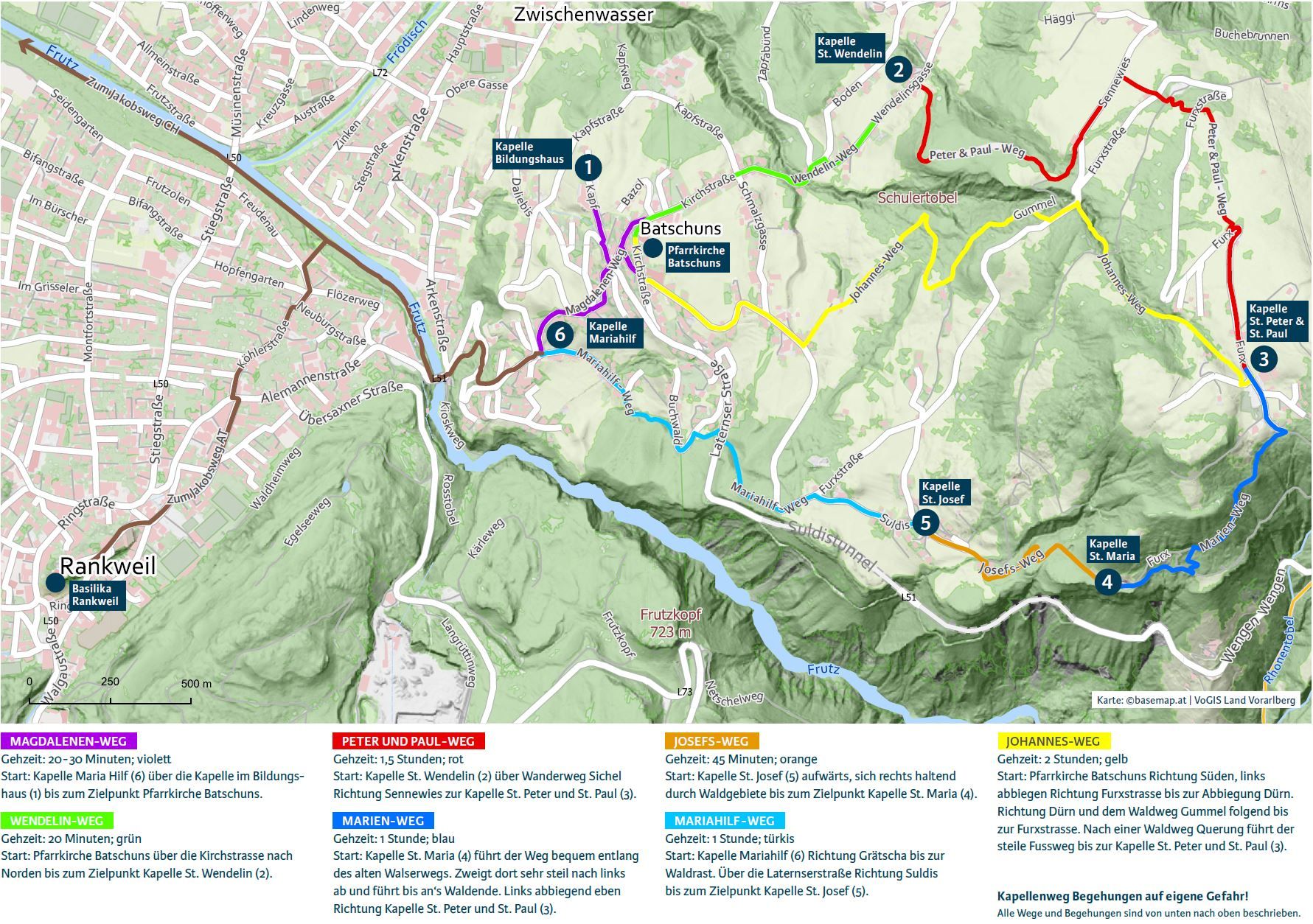 | Leicht ansteigend von der Kapelle Mariahilf (6) Unterbatschuns Richtung Grätscha und steil bis zum Gasthaus Waldrast. Überquerung der Laternserstrasse und steil den Waldweg hinauf bis zur Kurve der Furxstrasse. Danach bei der 1. Straße rechts nach Suldis abbiegen und von dort eben zur Kapelle St. Josef (5) Suldis. |