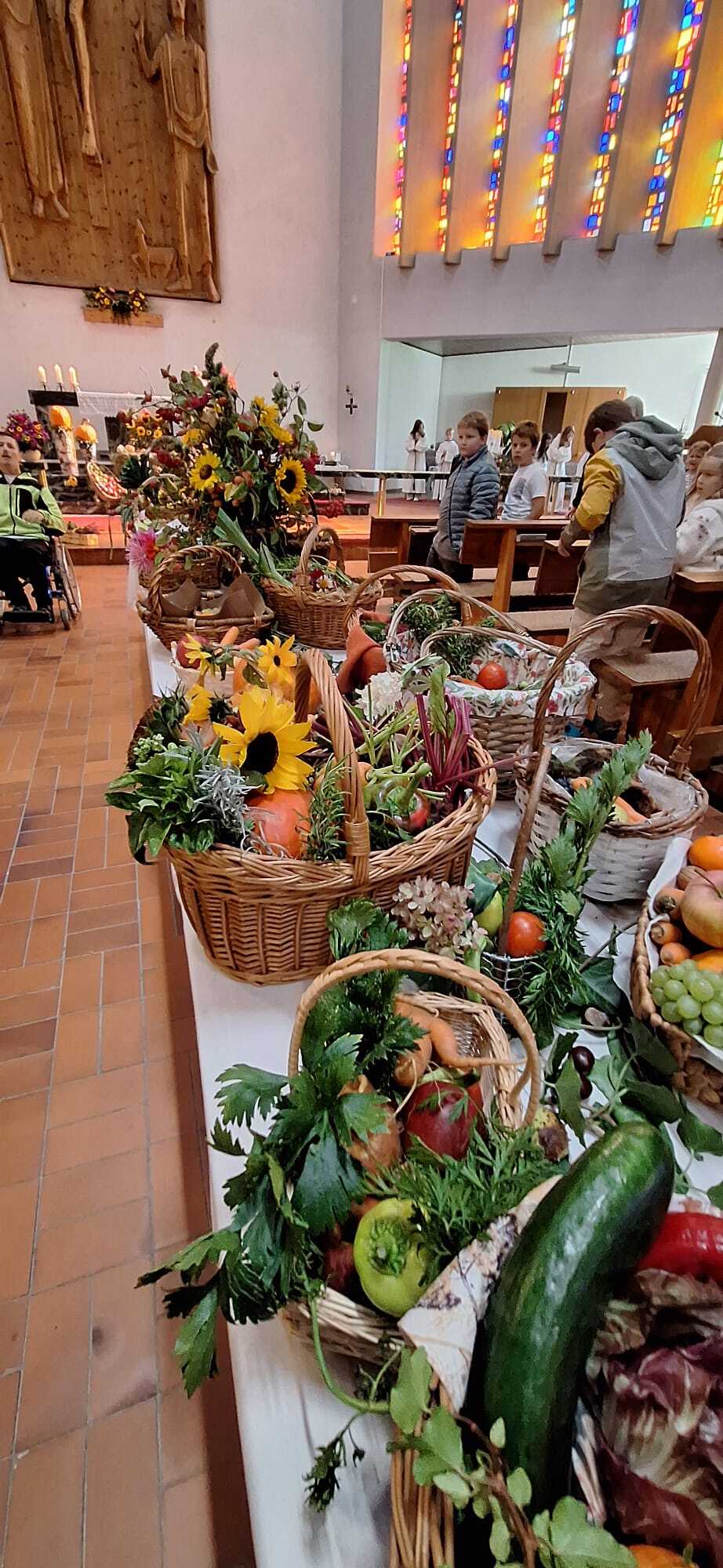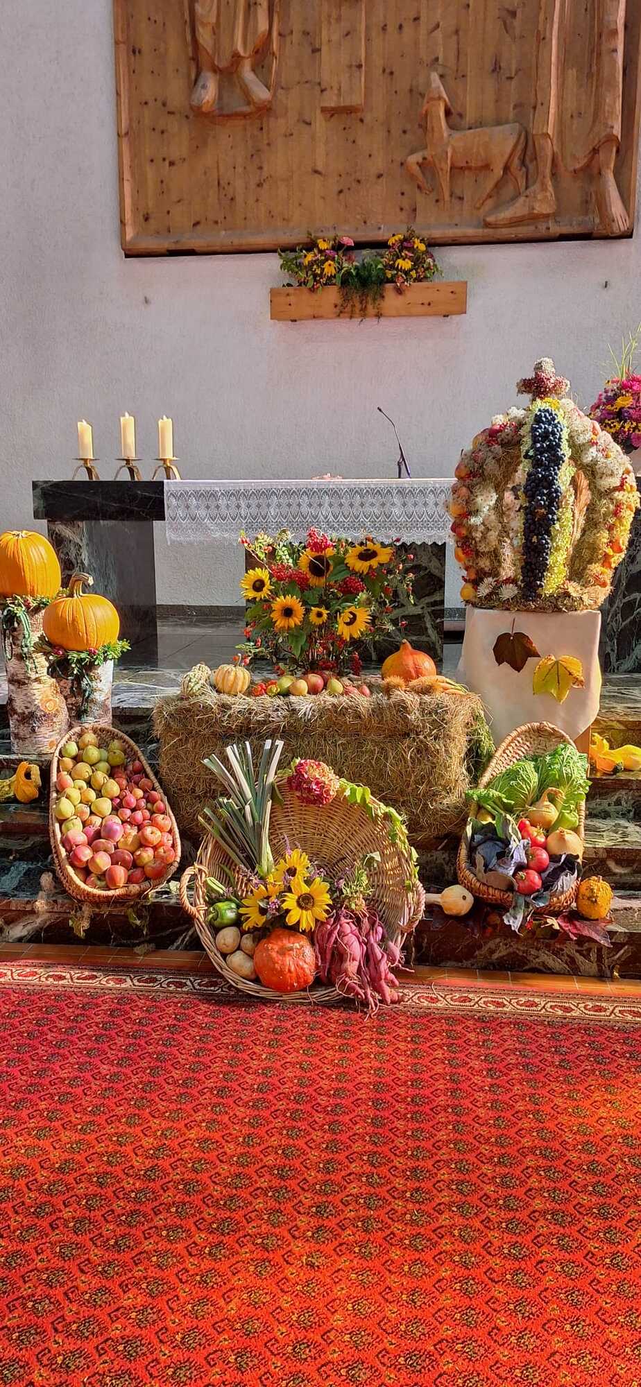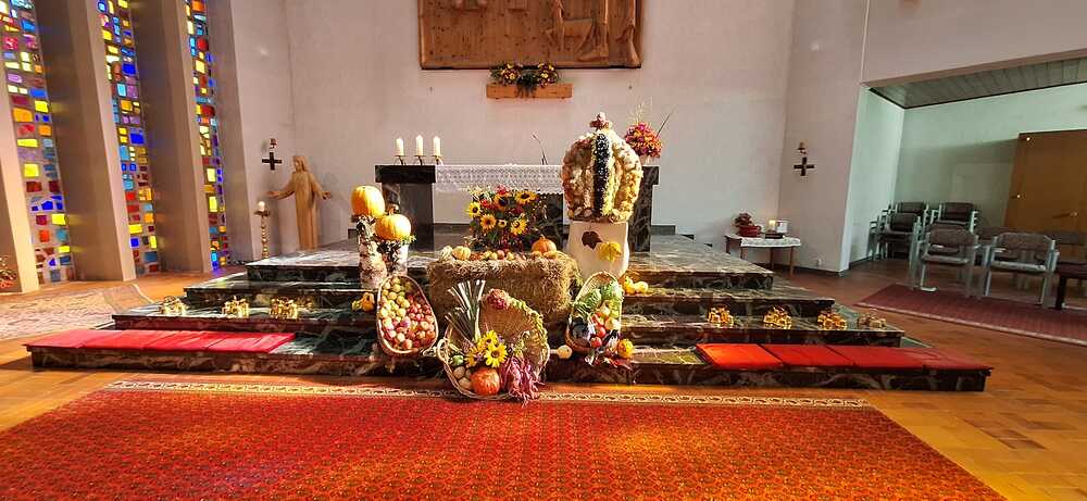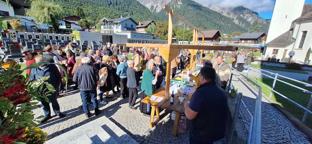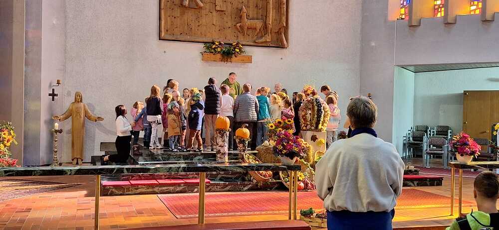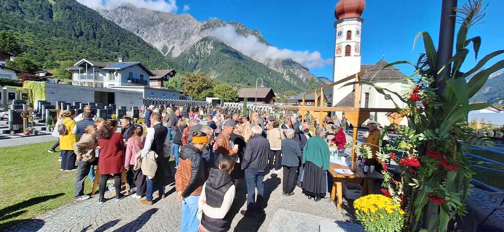 Bei der gut besuchten Messe wurden die vielen mitgebrachten Erntedankkörbe gesegnet. Zum Vater unser hat Pfarrer Hans die vielen Kinder zum Altar gebeten und der Kirchenchor Vandans hat den Gottesdienst musikalisch mitgestaltet. Die Kirche wurde vom Obst- und Gartenbauverein festlich geschmückt und hat anschließend an die Messe bei herrlichem Wetter zur Agapé mit Wein, Süßmost und süßem sowie pikantem Gebäck auf dem Kirchplatz eingeladen.